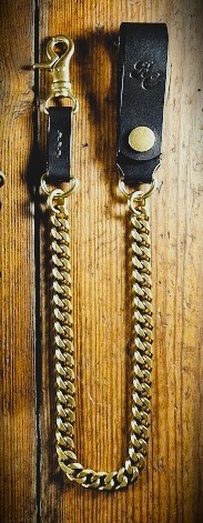 ( CLASSIC BIKER / TRUCKER WALLET CHAIN , IN SOLID BRASS & BLACK MONTANA LEATHER – PLEASE NOTE DESIRED TOTAL LENGTH WHEN ORDERING)